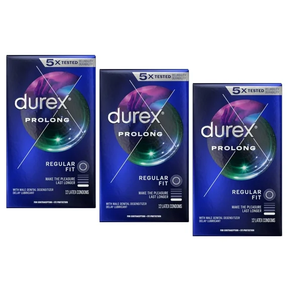 3 Pack Durex Prolong Ultra Fine Ribbed and Dotted Latex Condoms, 12 Each