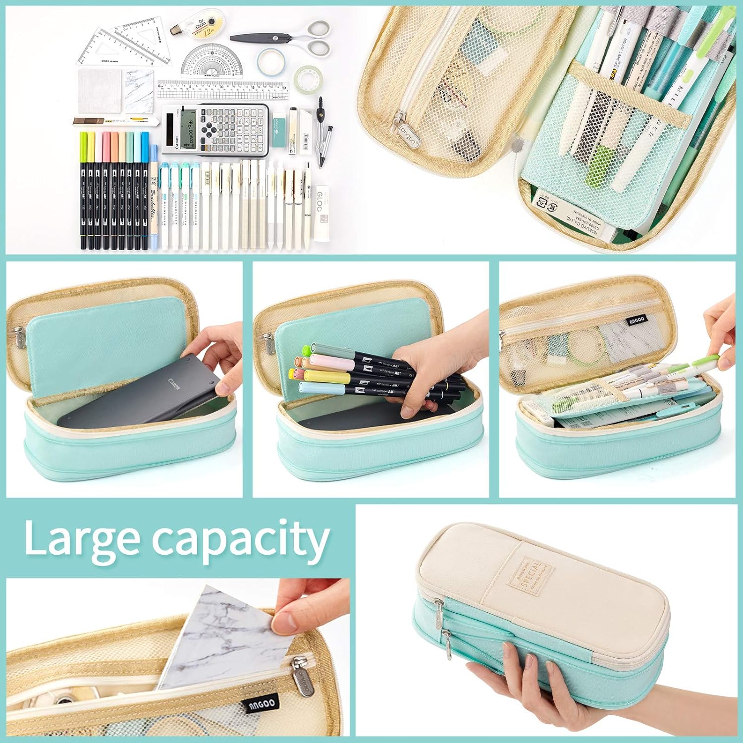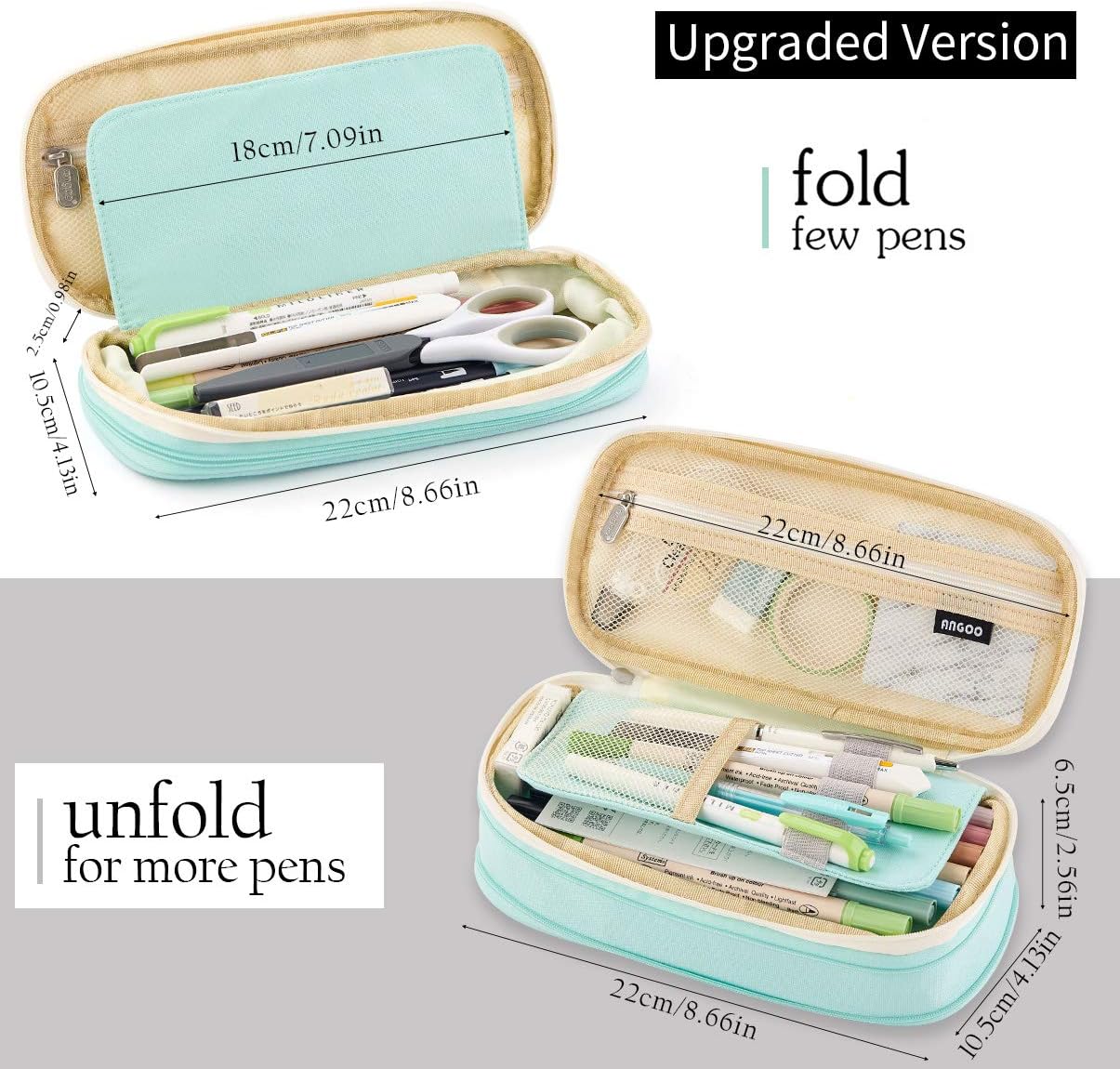 • [Large capacity] Upgraded size 8.66 x 4.13 x 2.56 inches with large capacity storage, can store up to 50 pens or 90 pencils, and can store small stationery in the mesh bag, such as Rubber, Sticker, etc. In the middle of the small mezzanine, can put a few shorter pens that are often used.