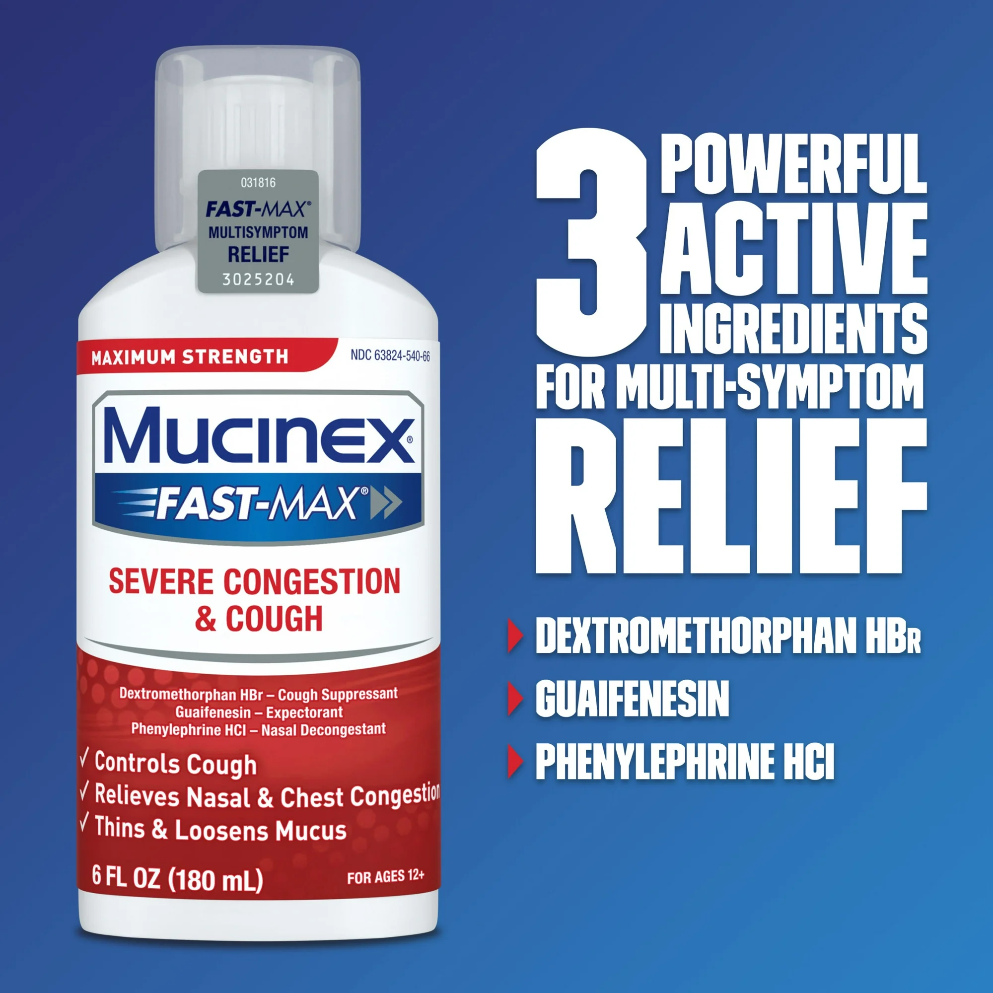 Maximum Strength Mucinex® Fast-Max Severe Congestion & Cough is a multi-Symptom relief medicine for your congestion & cough symptoms. Maximum Strength Mucinex® Fast-Max Severe Congestion & Cough helps relieve cough, thins and loosens mucus and relieves chest and nasal congestion. Mucinex® is the #1 Cough & Cold Brand Doctors Trust* and #1 Pharmacist Recommended Brand†. This product contains 6 Fluid Ounces. Use as directed, for Adults and Children 12 years of age and over.